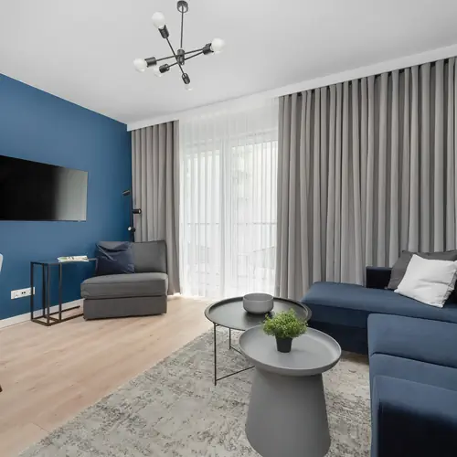 To eleganckie i nowoczesne studio jest przeznaczone dla trzech osób. Znajduje się ono na czwartym piętrze budynku, dzięki czemu z umeblowanego balkonu goście mogą podziwiać ładny widok na miejski krajobraz i okolicę. Apartament ma do zaoferowania gościom funkcjonalnie zagospodarowaną część mieszkalną, w której stoją dwie rozkładane sofy – jedno- i dwuosobowa. W pomieszczeniu stoi również jadalniany stół z krzesłami i biurko umożliwiające wygodną pracę zdalną. Goście mogą usiąść przy stolikach, aby zrelaksować się wieczorem przy oglądaniu kanałów telewizji naziemnej. Na powietrzu stoi stolik z dwoma krzesłami, dzięki czemu odwiedzający mogą w przyjemnej atmosferze wypić poranną kawę lub też zjeść przekąskę w przerwie od zaplanowanych aktywności. Praktycznie wyposażona część kuchenna pozwala na proste i szybkie przyrządzanie posiłków. Dostępne są tutaj takie sprzęty jak płyta indukcyjna, piekarnik, kuchenka mikrofalowa czy też czajnik elektryczny. Przywiezione rzeczy goście mogą przechowywać w pojemnej szafie. W łazience znajduje się prysznic wraz z powitalnym zestawem kosmetyków, ręcznikami, pralką i suszarką do włosów. Stylowa aranżacja sprawia, że studio jest świetnym wyborem zarówno na krótkie, jak i długoterminowe pobyty. Odcienie szarości oraz gustowne, ciemnoniebieskie barwy są urozmaiceniem jasnego, obfitującego w stonowane kolory takie jak biel i beż wnętrza.