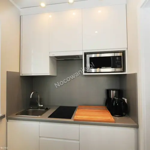 Każdy apartament o łącznej powierzchni ok. 22 mkw przeznaczony dla 2 osób, położony od strony południowo-zachodniej, posiada osobne wejście. Apartament dwupoziomowy urządzony w stylu skandynawskim, morską atmosferę podkreślają fototapety oraz nastrojowe oświetlenie. Na pierwszym poziomie znajduje się salon z wygodną sofą , komoda i telewizor, internet WiFi, łazienka, aneks kuchenny wyposażony w lodówkę, zlewozmywak, płytę indukcyjną, mikrofalówkę, komplet garnków, talerzy, patelnię, toster i czajnik elektryczny oraz ekspres do kawy. Łazienka nawiązuje wystrojem do nadmorskiego klimatu i naturalnego drewna, wyposażona jest w kabinę prysznicową, umywalkę i WC. Po schodach wchodzimy na drugi poziom, gdzie znajduje się sypialnia z wygodnym łożem małżeńskim. Jest wyposażona w komodę i szafę z dużym lustrem. Do sypialni przynależy balkonik ze stolikiem i krzesłami.
