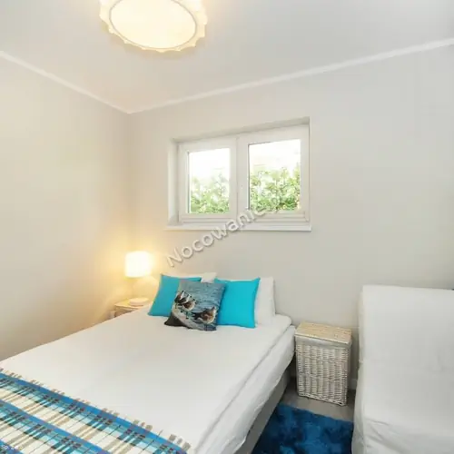 Każdy apartament o łącznej powierzchni ok. 24 mkw przeznaczony dla 3 osób, położony od strony wschodniej, posiada osobne wejście. Apartament dwupoziomowy urządzony w stylu skandynawskim, morską atmosferę podkreślają fototapety oraz nastrojowe oświetlenie. Na pierwszym poziomie znajduje się salon z wygodną sofą , komoda i telewizor, internet WiFi, łazienka, aneks kuchenny wyposażony w lodówkę, zlewozmywak, płytę indukcyjną, mikrofalówkę, komplet garnków, talerzy, patelnię, toster i czajnik elektryczny oraz ekspres do kawy. Łazienka nawiązuje wystrojem do nadmorskiego klimatu i naturalnego drewna, wyposażona jest w kabinę prysznicową, umywalkę i WC. Po schodach wchodzimy na drugi poziom, gdzie znajduje się sypialnia. Jest wyposażona w wygodną dwuosobową rozkładaną sofę, i dodatkowo jednoosobową sofę, dwie komody i szafę z dużym lustrem. Do sypialni przynależy balkonik ze stolikiem i krzesłami.