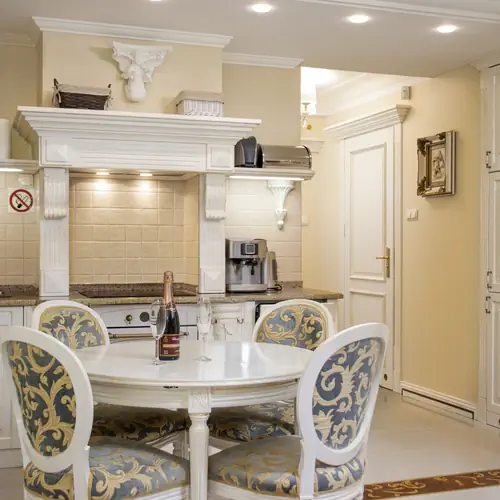 Luksusowe wyposażenie dwupokojowego apartamentu wykonane jest z niezwykłą dbałością, wyłącznie z naturalnych materiałów: meble z litego drewna, kowalstwo artystyczne i drewniane stylowe parkiety. Lokal wykończony elementami sztukaterii gipsowej i naturalnego kamienia.