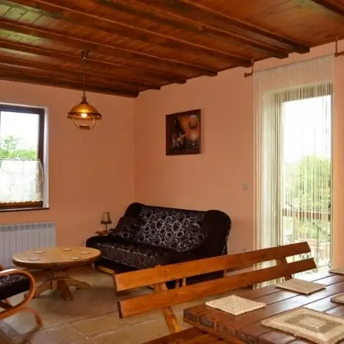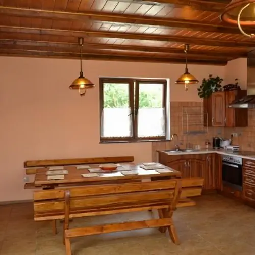 Parter domu to przedpokój,kuchnia z pełnym wyposażeniem i dużym drewnianym stołem przy którym 8osób może śmiało biesiadować do rana oraz przylegający do niej przytulnie i ciepło urządzony salonik wypoczynkowy z telewizją cyfrową oraz radiem, łazienka z prysznicem oraz pralką (do dyspozycji gości).