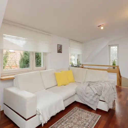 Ten przestronny dom z dwiema sypialniami, balkonem i dużym ogrodem zlokalizowany jest przy ulicy Dostępnej na warszawskim Bemowie. Obecność terenów zielonych, w tym pobliskiego Lasu Bemowo gwarantuje możliwość odpoczynku pośród natury. To idealne miejsce, na wycieczki rowerowe, długie wieczorne spacery czy poranny jogging. Jednocześnie dogodna lokalizacja pozwala na bezproblemowe dotarcie do ścisłego centrum Stolicy. Najbliższa stacja metra znajduje się w odległości zaledwie 2 km od obiektu, dzięki czemu już w kilkanaście minut można dotrzeć do Starego Miasta, by podziwiać zabytkową architekturę Warszawy. Miasto oferuje różne atrakcje, takie jak muzea, wycieczki piesze, kluby muzyczne i wiele innych! Niektóre z obowiązkowych miejsc na mapie to Pałac Kultury i Nauki, Muzeum Powstania Warszawskiego i Pałac w Wilanowie. W odległości 2.5 km od domu znajduje się droga ekspresowa S8, co sprawia, że na lotnisko Chopina można wygodnie dotrzeć w ciągu 25 minut.