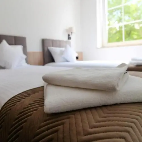 Dom Nazaret to komfortowe miejsce noclegowe położone w spokojnej, zielonej części Piekar Śląskich, w bezpośrednim sąsiedztwie Kalwarii Piekarskiej - jednej z najważniejszych atrakcji regionu. Dogodna lokalizacja, oraz przyjemna atmosfera sprawiają, że jest to idealny wybór zarówno dla osób podróżujących turystycznie, jak i służbowo. Obiekt został nowocześnie wyremontowany i oddany do użytku w 2024 roku, a aktualnie stara się o kategoryzację Hotelową. Do dyspozycji Gości oddajemy 50 funkcjonalnie urządzonych pokoi, z nowoczesną klimatyzacją, prywatnymi łazienkami, i bezpłatnym dostępem do Wi-fi. Obiekt oferuje również darmowy parking oraz Recepcję czynną całą dobę, co zapewnia wygodę i elastyczność podczas pobytu. Codziennie rano w części Restauracyjnej serwujemy śniadania zarówno w formie bufetu jak i a'la carte. A w ciągu dnia Goście mogą skorzystać z oferty obiadowej. To doskonała oferta dla tych, którzy cenią sobie wygodę oraz lokalne smaki. Dla klientów biznesowych przygotowaliśmy dwie nowoczesne sale konferencyjne, wyposażone w profesjonalny sprzęt audiowizualny, projektory, system nagłośnienia, oraz wszelkie niezbędne akcesoria do prowadzenia szkoleń, prezentacji, czy spotkań biznesowych. Jednym z największych atutów miejsca jest przestronny, widokowy taras, z którego rozpościera się zapierający dech w piersiach widok na Kalwarię Piekarską i otaczającą ją zieloną przestrzeń. To idealne miejsce na poranną kawę, popołudniowy relaks czy wieczorne chwile w ciszy - wśród śpiewu ptaków i z panoramą parku. Taras został zaprojektowany z myślą o komforcie naszych Gości - znajdziesz tu wygodne meble ogrodowe, parasole chroniące przed słońcem, a wieczorami dyskretne oświetlenie tworzy przytulną, sprzyjającą wyciszeniu atmosferę. Jest to także idealna przestrzeń do rozmów, medytacji lub kameralnych spotkań w gronie najbliższych. Dom Nazaret to spokojne miejsce z profesjonalną obsługą, które łączy funkcjonalność z atmosferą sprzyjającą wypoczynkowi i skupieniu