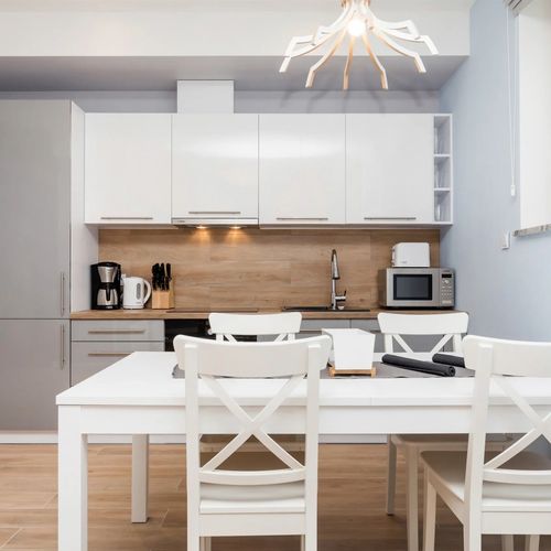 Stół z 6 krzesłami, zmywarka do naczyń, czajnik, ekspres do kawy, toster, kuchenka mikrofalowa, lodówka z zamrażarką, kuchenka z piekarnikiem, szklanki, zestaw garnków, sztućców, patelnia