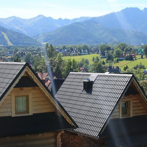 Domek w stylu góralskim z pięknymi widokami na całą panoramę Tatr. 2 przytulne 3 osobowe sypialnie. Jedna z nich posiada łoże małżeńskie i łóżko pojedyncze, balkon z widokiem na góry. Druga sypialnia z łożem małżeńskim i łóżkiem pojedynczym z widokiem na ogród, oknem, z którego można podziwiać piękne zachody słońca. Na parterze znajduje się aneks kuchenny z kuchenką indukcyjną, mikrofalą, czajnikiem , lodówką, zmywarką do naczyń, łazienka z kabiną z hydromasażem (bez ręczników), salon z TV, wypoczynkiem z możliwością noclegu dla 2 osób , tarasem z widokiem na góry. Dojście do domku schodami wysokości jednego piętra.