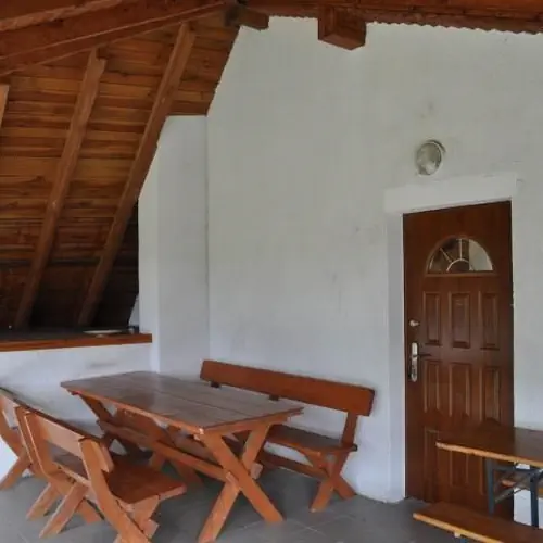 Przed wejściem duży taras z dużym drewnianym stołem i ławami.