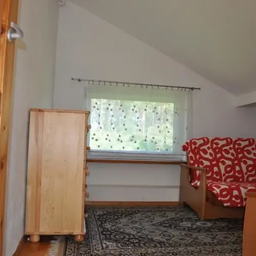 Domek składa się z 2 oddzielnych pokoi (w każdym po dwie 2-osobowe miejsca do spania), salonu z kominkiem, kuchni oraz łazienki. Dodatkowo w salonie są dwie dwuosobowe wersalki. W kuchni znajdują się dwie lodówki, mikrofalówka, zmywarka, płyta elektryczna dwupalnikowa.