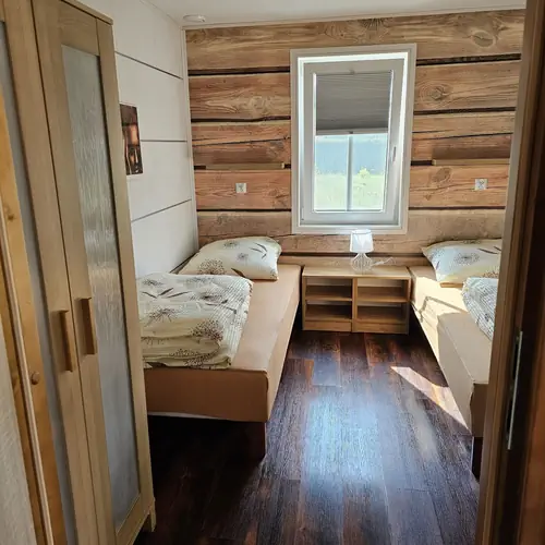 Sypialnia 2: dwa pojedyncze łóżka, szafa, stolik nocny.