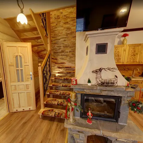 W domkach znajdują się 3 pokoje 2-osobowe, dwie łazienki, kuchnia i salon z kominkiem. Wykończone w stylu regionalnym, drewniane.