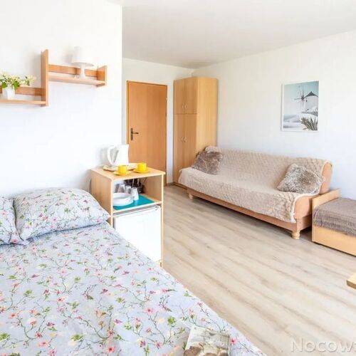 Oferujemy Państwu wypoczynek w pokojach z łazienkami z pełnym węzłem sanitarnym. Pokoje wyposażone są w telewizor, lodówkę, czajnik bezprzewodowy, podstawowe naczynia, parawan , szafę na odzież , stolik z krzesłami ,