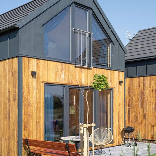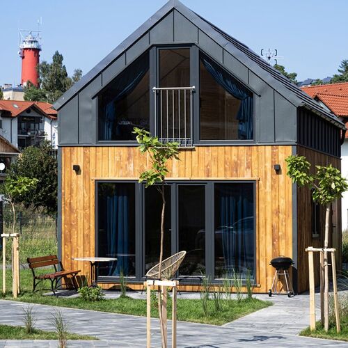 Każdy domek to 70m2 komfortu. Na parterze znajduje się aż 30-metrowa wygodna przestrzeń dzienna, w której skład wchodzą salon z aneksem kuchennym i stołem jadalnianym. W tej części domu umieściliśmy też łazienkę z prysznicem. Na piętrze natomiast znajdują się 2 sypialnie (14 i 18m2) i dodatkowa toaleta dla komfortu naszych gości.