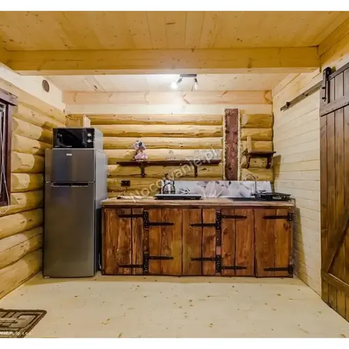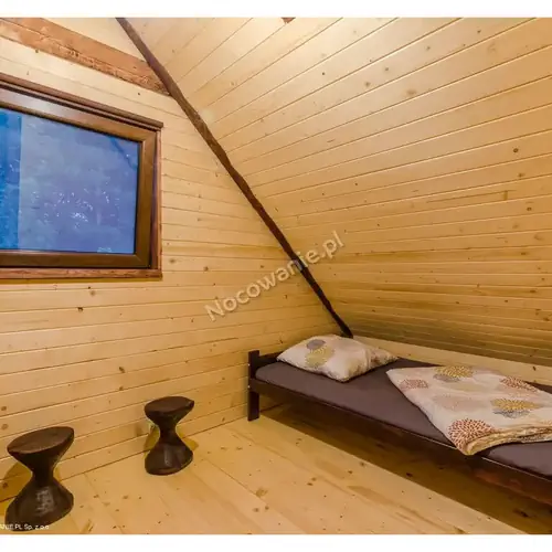 Na parterze domku znajduje się salon z aneksem kuchennym wyposażonym w czajnik elektryczny, kuchenkę mikrofalową, lodówkę, kuchenkę gazową, komplet naczyń itp. oraz łazienka z natryskiem. Na poddaszu są dwa pokoje trzyosobowe różnej wielkości.
