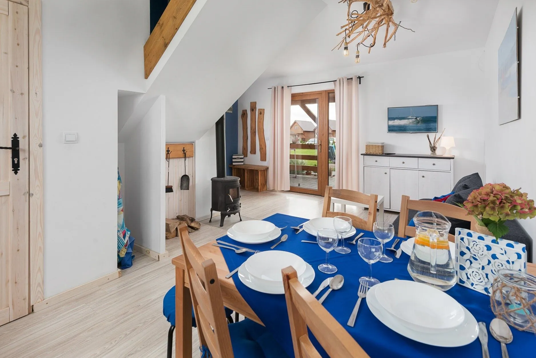 - parter (35 m2) : kuchnia w pełni wyposażona (lodówka, kuchenka elektryczna i mikrofalowa, czajnik, garnki i pełna zastawa), jadalnia, dwuosobowa rozkładana sofa, łazienka z prysznicem, telewizor, kominek
