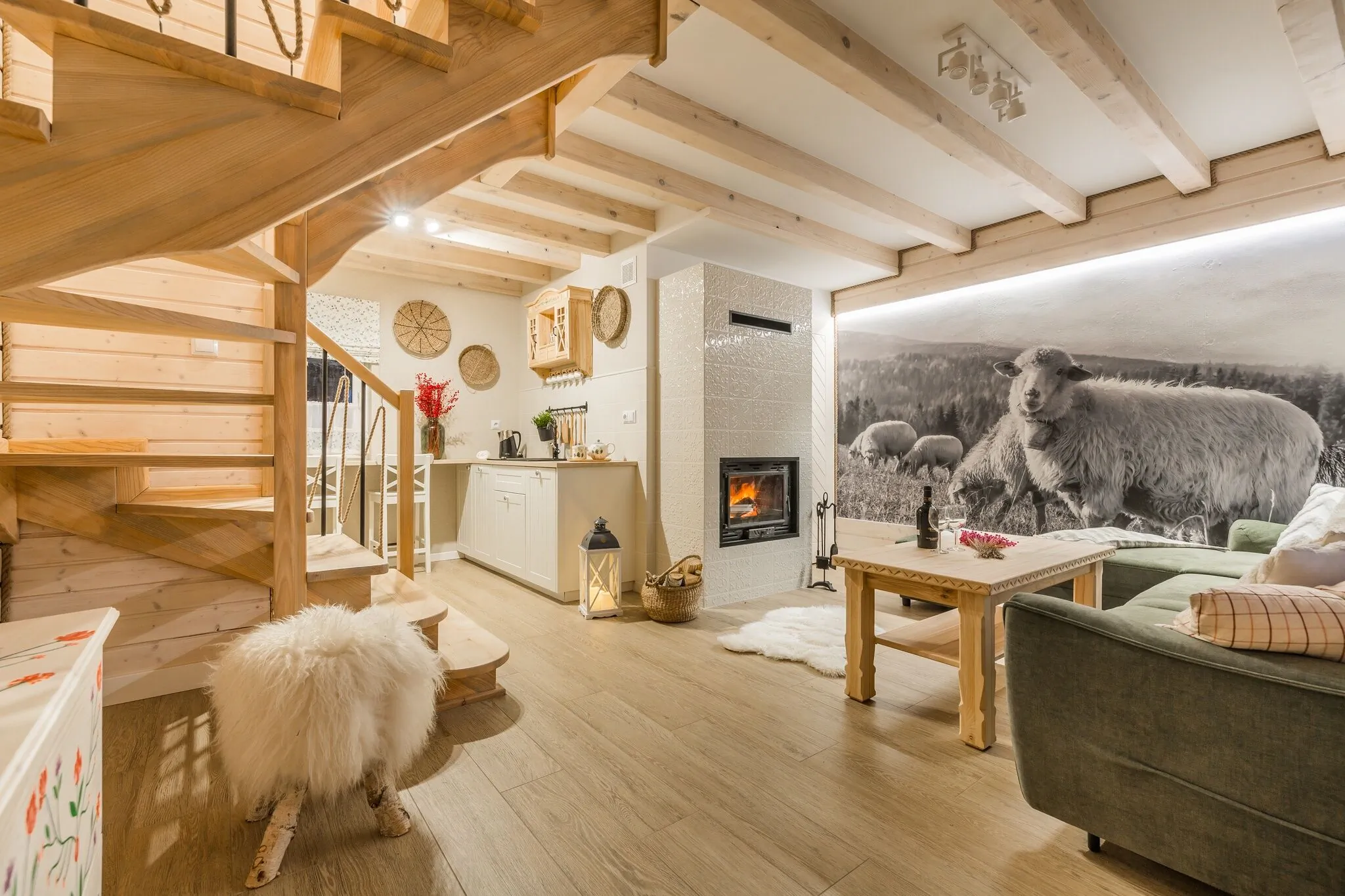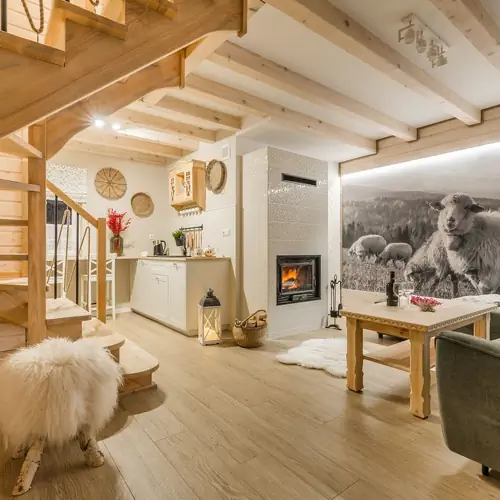 – salon z kominkiem (TV-65 cali, wifi, narożnik rozkładany dla dwóch osób z funkcją typu stelaż włoski, ława, skrzynia na ubrania