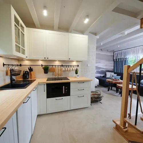 Domek posiada nowoczesną kuchnię, w pełni wyposażoną, m.in. w: