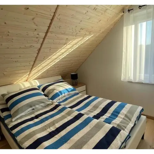 DOMEK OLA na parterze znajduje się salon z aneksem kuchennym, sypialnia małżeńska oraz łazienka. Na piętrze znajdują się dwie sypialnie: jedna małżeńska, druga czteroosobowa (łóżka pojedyncze). Wyposażenie domku j.w. oprócz zmywarki i klimatyzacji.
