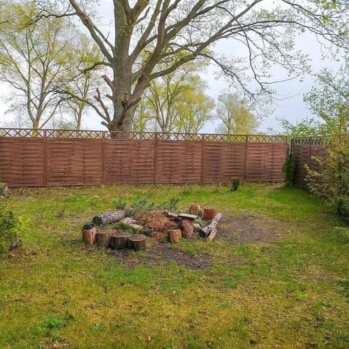 Działka ogrodzona w całości do dyspozycji gości, parking, miejsce na ognisko, grill, zamykana szopa na rowery, zestaw parawan + leżaki plażowe.