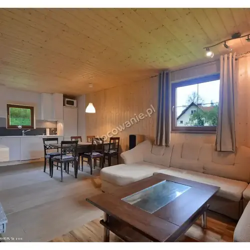 W każdym z domków znajduje się taras (stół oraz krzesła), salon z rogową sofą i kominkiem (drewno opałowe w cenie), stół jadalny z krzesłami, w pełni wyposażona kuchnia (lodówka, zamrażarka, czajnik, zmywarka, ekspres do kawy, mikrofalówka, płyta grzewcza z 4 palnikami, piekarnik, sztućce, talerze, garnki), łazienka oraz 2 sypialnie na górze.