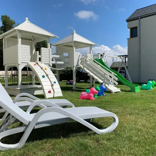Na działce o powierzchni 3000 m2 usytuowane są po dwa miejsca parkingowe przed każdym budynkiem oraz plac zabaw dla najmłodszych wyposażony w trampolinę, domki ze ścianką wspinaczkową, bocianie gniazdo, piaskownicę, zjeżdżalnię, bujawki, jeździki, bramki do piłkinożnej, turnball.
