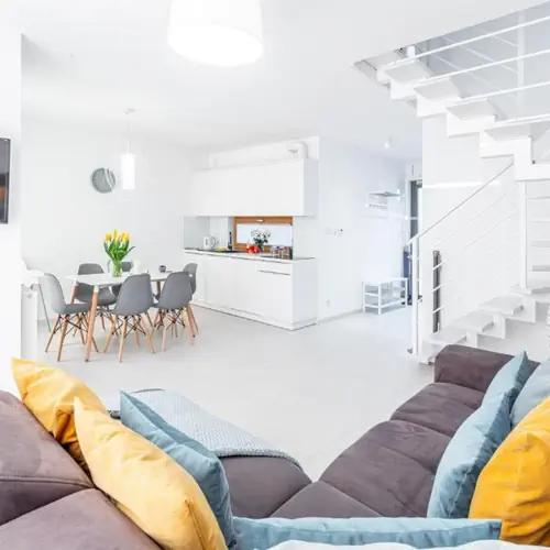 W domkach 8-osobowych na parterze znajduje się salon z dużym luksusowym i rozkładanym narożnikiem, aneks kuchenny, jadalnia, łazienka i osobno wc. Na piętrze trzy przestronne sypialnie 2 osobowe. Powierzchnia apartamentu ponad 70 m2. Dodatkowo duży taras przy każdym domku.