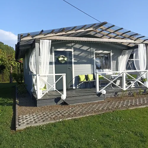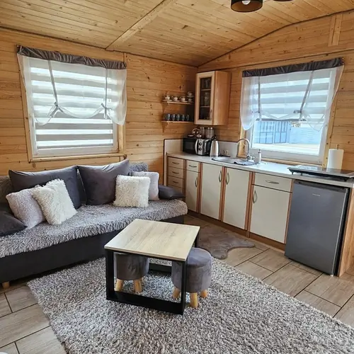Do dyspozycji dwa nowe i nowoczesne domki 4 osobowe z aneksem kuchennym w pełni wyposażonym (lodówka, płyta indukcyjna, toster, kuchenka mikrofalowa, naczynia, garnki i patelnie, sztućce).