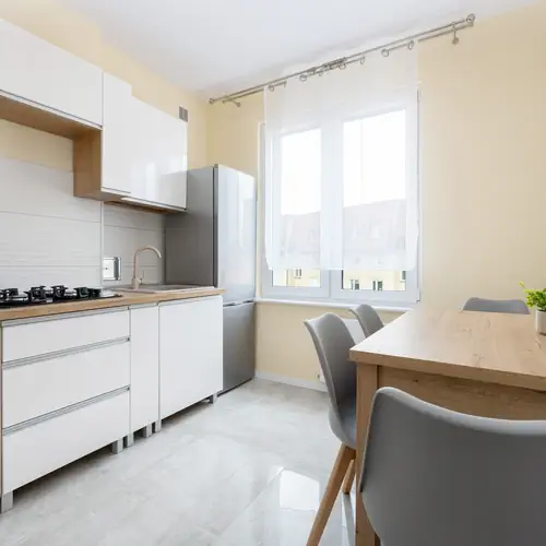 Stół z 4 krzesłami, czajnik, ekspres do kawy, toster, płyta gazowa, lodówka z zamrażarką, szklanki, komplet garnków, sztućców, patelnia