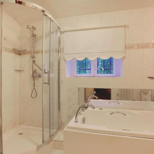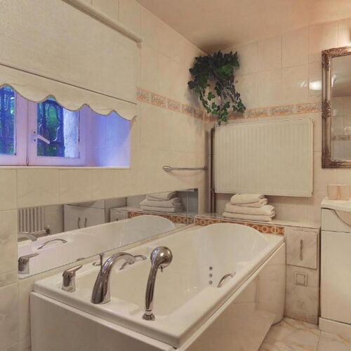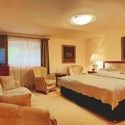 Pokoje 2 osobowe, każdy z łazienką, luksusowo wyposażone (lodówka, budzik, czajnik elektryczny) również w apartamentach łazienki z wanną do hydromasażu, sauna, zamknięty parking, internet bezprzewodowy. W pięknym salonie jadalnym z mini barkiem można zjeść dobre sniadanie lub spędzić miłe chwile przy kominku popijając napoje zimne lub gorące.