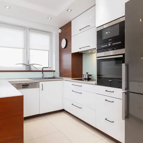 Płyta indukcyjna, pochłaniacz pary, lodówka z zamrażarką, czajnik, piekarnik, kuchenka mikrofalowa, zmywarka, sztućce, naczynia, garnki, patelnia, kieliszki do wina.