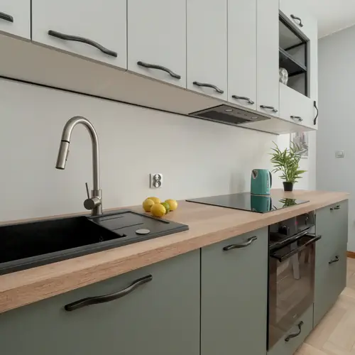 Płyta indukcyjna, zmywarka, piekarnik, lodówka z zamrażarką, czajnik elektryczny, zastawa stołowa