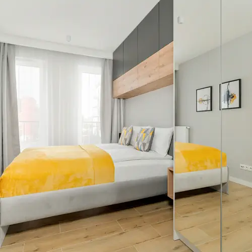 Ten komfortowy apartament może ugościć 4 osoby - jest to odpowiedni wybór na rodzinny wyjazd lub dla grupy przyjaciół. Wysoce funkcjonalna przestrzeń o powierzchni 43 m² składa się z salonu z aneksem kuchennym, sypialni oraz łazienki z prysznicem i toaletą. Część dzienna wyposażona w wygodną sofę oraz telewizor z płaskim ekranem, jak również sypialnia z łóżkiem małżeńskim, stanowią doskonałe miejsce odpoczynku i relaksu. Do dyspozycji gości jest także balkon z meblami ogrodowymi, gdzie można delektować się poranną kawą. Szeroki wachlarz udogodnień oraz kompleksowe wyposażenie apartamentu w niezbędne akcesoria i sprzęty kuchenne, jak i łazienkowe gwarantuje komfort pobytu. Dla ułatwienia rozpoczęcia każdej wizyty zapewniono bezpłatny zestaw kosmetyków (mydło, szampon i żel pod prysznic), ręczniki oraz pościel. Na wyposażeniu mieszkania goście znajdą również pralkę, co z pewnością docenią rodziny z małymi dziećmi czy osoby planujące dłuższy pobyt. Obiekt wyróżnia się starannym wykończeniem, wnętrze jest gustowne i urządzone w nowoczesnym stylu.
