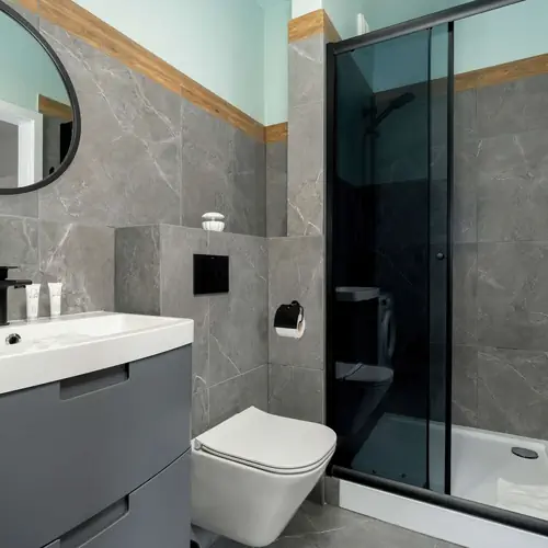 Prysznic, toaleta, umywalka, pralka, suszarka do włosów, lustro, ręczniki