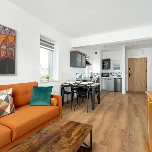 Ten elegancki i przytulny apartament jest przeznaczony dla czterech osób. Lokal dysponuje tarasem, a także jedną sypialnią, w której stoi wygodne łóżko dwuosobowe, pojemna szafa oraz szafka idealna do przechowywania podręcznych drobiazgów. W salonie znajduje się rozkładana sofa dwuosobowa w wyrazistym kolorze pomarańczowym, jadalniany stół z krzesłami, płaskoekranowy telewizor z dostępem do kanałów kablowych i stolik, przy którym można pracować zdalnie. Szybkie i łatwe przygotowywanie posiłków umożliwia funkcjonalnie wyposażony aneks kuchenny. Dostępne są w nim takie sprzęty jak piekarnik, kuchenka mikrofalowa, czajnik elektryczny czy też płyta indukcyjna. W łazience na odwiedzających czeka powitalny zestaw kosmetyków z ręcznikami, prysznic, pralka i suszarka do włosów. Wystrój wnętrza jest elegancki i gustowny. Dominują tutaj drewniane akcenty i odcienie szarości. Dzięki temu przestrzeń jest przytulna i komfortowa w użytkowaniu. To wspaniałe miejsce dla uczestników wyjazdów biznesowych, rodziców podróżujących z dziećmi i grup przyjaciół.