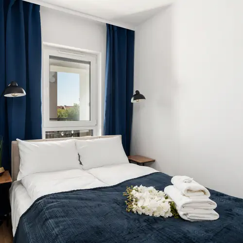 Stylowy apartament może zakwaterować 4 osoby. Składa się z salonu z aneksem kuchennym, sypialni oraz łazienki z prysznicem. Wnętrze jest przestronne, funkcjonalnie zaprojektowane i gustownie wykończone, wychodząc naprzeciw wszelkim potrzebom gości. Wyjątkowy wystrój apartamentu umiejętnie łączy odcienie szarości z akcentami kolorystycznymi oraz drewnianymi detalami. Część dzienna wyposażona w wygodną sofę oraz telewizor z płaskim ekranem stanowi doskonałe miejsce odpoczynku i relaksu. Apartament posiada dostęp do szybkiego bezpłatnego Internetu Wifi. Sypialnia oferuje bardzo wygodne łóżko małżeńskie. Do dyspozycji gości jest także balkon z meblami ogrodowymi – idealne miejsce na łyk porannej kawy. Dodatkowo, aneks kuchenny wyposażony jest w wysokiej jakości sprzęt AGD (mikrofalówka, ekspres do kawy, zmywarka, piekarnik), który pozwoli na przygotowanie ulubionych posiłków. Szeroki wachlarz udogodnień oraz kompleksowe wyposażenie apartamentu w niezbędne akcesoria i sprzęty kuchenne, jak i łazienkowe gwarantuje komfort pobytu. Apartament jest idealnym miejscem na każdy rodzaj pobytu, szczególnie jeśli cenisz sobie komfort i piękny wystrój. Dla ułatwienia rozpoczęcia każdego noclegu zapewniono bezpłatny zestaw kosmetyków (mydło, szampon i żel pod prysznic), ręczniki oraz pościel. Zapraszamy również gości podróżujących ze zwierzętami, ponieważ jest to apartament przyjazny pupilom (100 PLN/Pobyt). Do apartamentu przynależy również miejsce parkingowe w hali garażowej, co jest atutem, szczególnie w sezonie wakacyjnym.
