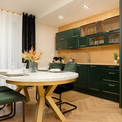 Zestaw sztućców i naczyń, płyta indukcyjna, lodówka, zamrażarka, piekarnik (z funkcją mikrofalówki), przybory kuchenne, czajnik, szklanki, kubki, garnki, patelnia, kieliszki do wina, zmywarka, ekspres do kawy
