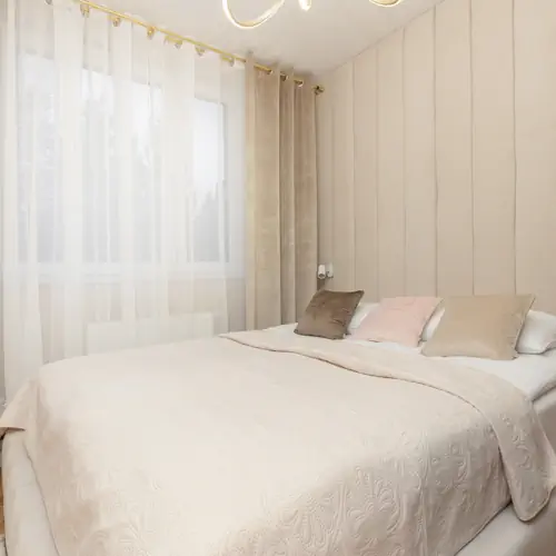 Komfortowy układ spania obejmuje podwójne łóżko w sypialni oraz dwuosobową rozkładaną sofę w salonie. Jest idealny dla czterech osób, co czyni go świetną propozycją dla rodzin czy grup znajomych zwiedzających stolicę. Jest doskonałym wyborem dla podróżnych, którzy nie uznają kompromisów w kwestii stylu i komfortu. Goście pracujący zdalnie znajdą tu również wygodne miejsce do pracy z laptopem, a dzięki szybkiemu połączeniu internetowemu, nie muszą martwić się o wypełnianie swoich codziennych obowiązków. Słoneczny taras należący do apartamentu zapewnia świetne miejsce do spędzenia czasu z filiżanką aromatycznej kawy. Otwarta na salon kuchnia jest w pełni wyposażona we wszystkie niezbędne urządzenia i przybory. Powitalny zestaw bezpłatnych kosmetyków, ręczników i pościeli zmniejsza stres związany z pakowaniem się przed urlopem.
