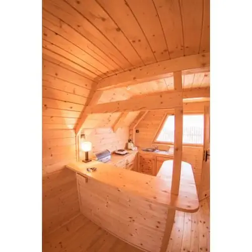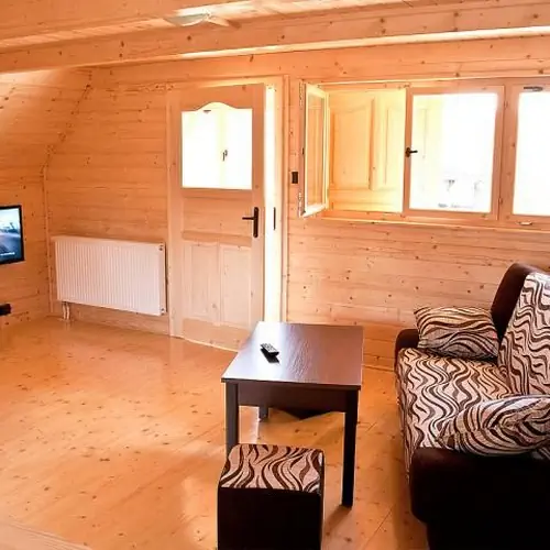 Domki są drewniane, w skład wchodzą dwa pokoje dwuosobowe na pieterku, na dole przedpokój, salon z telewizją, łazienka i wyposarzony aneks kuchenny ( także lodówka). Domki pachną jeszcze drewnem.