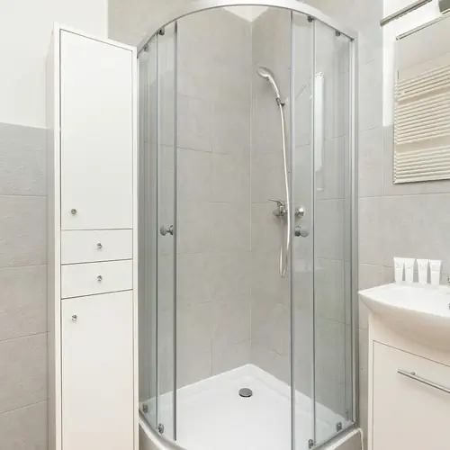 Prysznic, umywalka, wc, lustro, szafka, suszarka do włosów, pralka.
