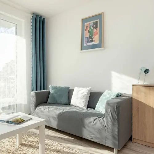 Ten przytulny apartament o powierzchni 38 m² to idealne miejsce na pobyt dla dwóch osób. Składa się z przestronnego salonu z aneksem kuchennym, oddzielnej sypialni, łazienki z prysznicem oraz balkonu. Jasne i funkcjonalne wnętrze zostało zaprojektowane z myślą o komforcie gości. W salonie znajduje się wygodna sofa, która w ciągu dnia służy do odpoczynku, a wieczorem można zrelaksować się przy telewizorze z funkcją Smart TV. Z tej części mieszkania można wyjść na balkon i cieszyć się świeżym powietrzem. Do wspólnych posiłków doskonale sprawdzi się duży stół jadalniany. Aneks kuchenny jest w pełni wyposażony – do dyspozycji gości pozostają piekarnik, płyta indukcyjna, lodówka oraz kuchenka mikrofalowa, co pozwala na swobodne przygotowywanie posiłków. W sypialni znajduje się wygodne łóżko podwójne oraz przestronna szafa, zapewniająca wystarczającą ilość miejsca na przechowywanie rzeczy. W całym apartamencie dostępne jest szybkie połączenie WiFi, co zapewnia komfortową komunikację i dostęp do multimediów. Dla dodatkowego komfortu gości apartament wyposażono w pralkę, co szczególnie docenią osoby planujące dłuższy pobyt. Na dobry początek oferujemy bezpłatny zestaw kosmetyków, ręczniki oraz pościel.