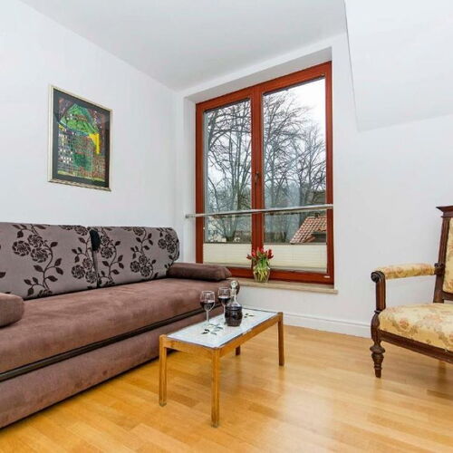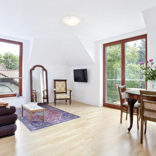 Apartament położony w urokliwej i ustronnej części Górnego Sopotu, w pobliżu lasu a z dala od zgiełku głównych ulic. Spacer do sopockiego deptaka zajmie ok 5 min, a do plaży 10 min. Mieszkanie znajduje się na drugim piętrze posesji z miejscem parkingowym. Apartament przeznaczony dla max 4 osób. Składa się z sypialni z dwuosobowym łóżkiem i pojemną szafą oraz salonu z dwuosobową sofą i ze stołem z krzesłami. Apartament posiada balkon ze stolikiem i krzesłami, aneks kuchenny z możliwością samodzielnego przygotowywania posiłków, łazienkę z pralką i kabiną prysznicową, TV oraz internet.