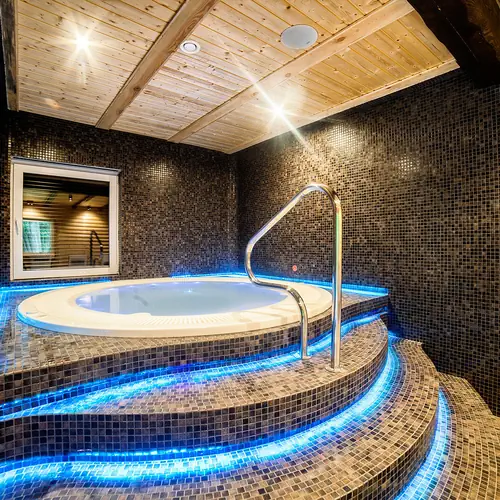 Strefa Wellness składa się z łaźni fińskiej (suchej), łaźni parowej, jacuzzi z hydromasażem oraz przylegającej do nich strefy relaksu, w której przy odprężającej muzyce błogo jest odpocząć pomiędzy zabiegami. Cała strefa idealnie wkomponowana jest w otaczający nas krajobraz i wszechobecną przyrodę – głównymi elementami wystroju są drewno i kamień, dominują kolory naturalne, stonowane, które podkreśla nastrojowe oświetlenie.