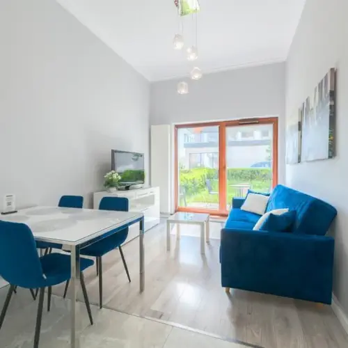 Ten urokliwy apartament oferuje komfortowe i stylowe wnętrze, które łączy elegancki minimalizm z przytulnością. W przestronnym salonie znajduje się rozkładana sofa w intensywnym odcieniu błękitu, doskonała zarówno do odpoczynku, jak i dodatkowego łóżka na noc. Uzupełnia ją prosty stolik kawowy oraz stół z czterema krzesłami, tworząc przestrzeń idealną do codziennych posiłków lub wspólnego spędzania czasu. Duże okna prowadzą na przytulny taras, który otacza zielony ogródek – doskonałe miejsce na relaks na świeżym powietrzu, z kawą w ręku lub przy dobrej literaturze. Aneks kuchenny wyposażony jest w nowoczesne urządzenia, w tym płytę indukcyjną, lodówkę, mikrofalę i czajnik elektryczny, co zapewnia wygodę przy gotowaniu zarówno podczas krótkich, jak i długich pobytów. Sypialnia to przestrzeń zaprojektowana z myślą o wygodzie i odpoczynku. Znajduje się tu łóżko małżeńskie oraz eleganckie meble: szafki nocne i duża szafa, oferująca sporo miejsca do przechowywania. Całość dopełnia minimalistyczna dekoracja oraz tapeta w subtelnym, ale nowoczesnym wzorze. Łazienka jest przykładem nowoczesnego designu z funkcjonalnymi rozwiązaniami. Przestronny prysznic z przezroczystymi drzwiami, elegancka umywalka oraz wysokiej jakości płytki, które tworzą atmosferę luksusu. W komplecie znajdują się również ręczniki, zestaw powitalnych kosmetyków oraz suszarka do włosów. Dzięki swojej funkcjonalności, nowoczesnemu wyposażeniu i wyjątkowemu stylowi, apartament stanowi doskonałe miejsce na wypoczynek i relaks w sercu miasta, łącząc elegancję z wygodą.