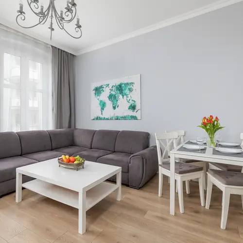 Ten gustownie urządzony apartament ma do zaoferowania gościom dużą, efektywnie zagospodarowaną powierzchnię, dzięki czemu jest to wspaniała lokalizacja dla osób pracujących zdalnie, rodziców organizujących wyjazd z dziećmi, czy też par i przyjaciół. Lokal jest przeznaczony dla czterech osób i znajduje się na pierwszym piętrze budynku, na które można wejść schodami. Dostępna jest tutaj jedna sypialnia, w której stoi duże biurko umożliwiające wygodne wykonywanie zadań służbowych, komfortowe łóżko dwuosobowe oraz sofa, stojący klimatyzator i pojemna szafa. W salonie odwiedzający mogą podziwiać z okna piękny widok na rzekę i miejski krajobraz. W pomieszczeniu umieszczono rozkładany narożnik, jadalniany stół z krzesłami, a także stolik, przy którym można napić się porannej kawy. W oddzielnej kuchni do dyspozycji gości jest piekarnik, kuchenka mikrofalowa, pralka i lodówka z zamrażarką. Można tu wygodnie przygotowywać przekąski i posiłki. W apartamencie znajduje się łazienka z bezprogowym prysznicem oraz dodatkowa toaleta. W jasnym wystroju pojawiają się ciemne akcenty w odcieniach niebieskiego i szarości, dzięki czemu aranżacja jest urozmaicona i nowoczesna.