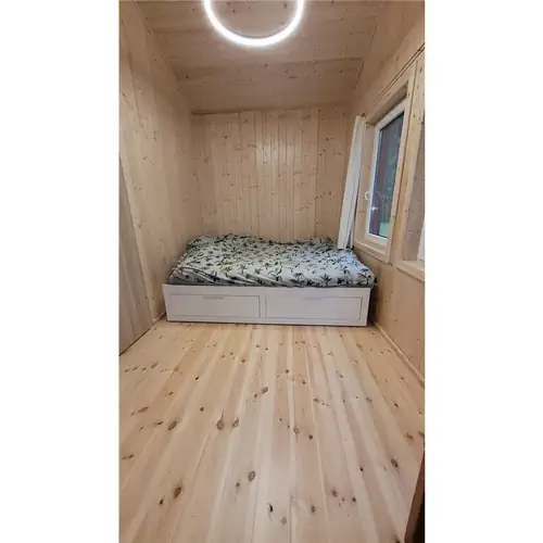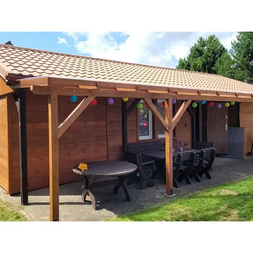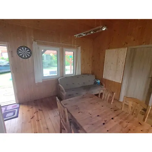 Przy domku jest sauna, duży zadaszony taras. Zabawki dla dzieci, piaskownica, hamak, huśtawka, piłki, kosz do koszykówki, meble ogrodowe, leżaki, miejsce na ognisko, grill.