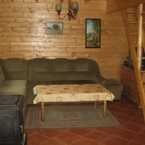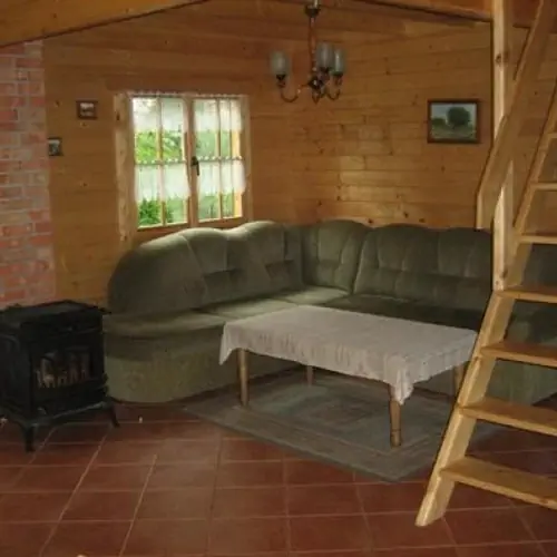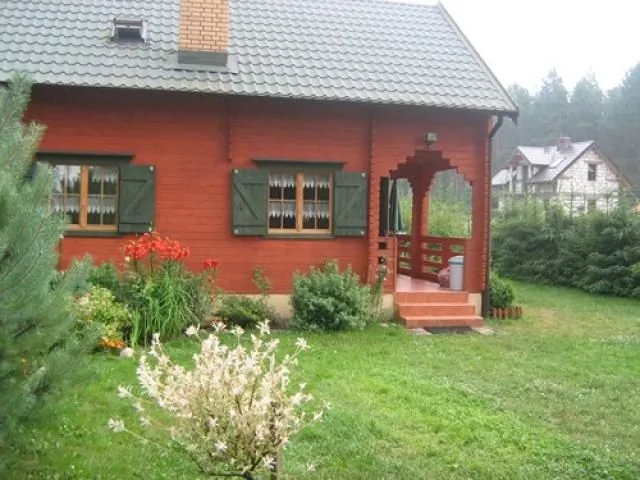 Dom letniskowy z bali drewnianych o powierzchni 75m2 z dużym tarasem, znajdujący się na ogrodzonej działce. Dom przystosowany jest dla 7 osób z pełnymi wygodami.