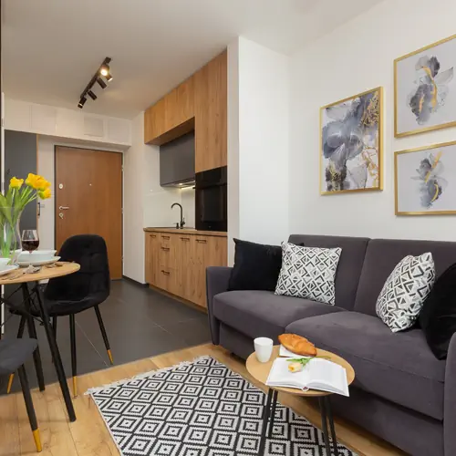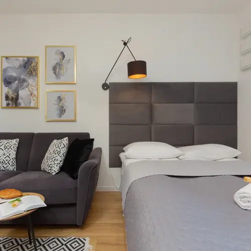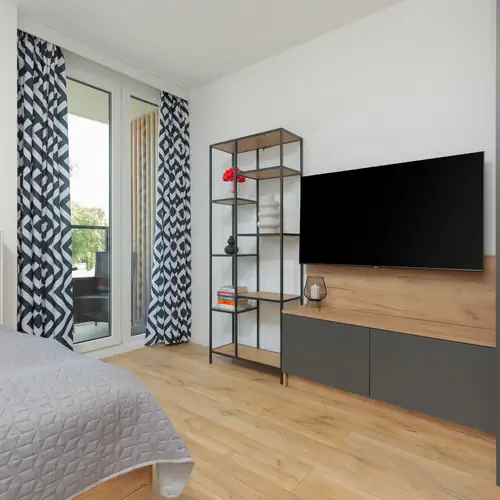 Nowocześnie wykończony apartament typu studio może gościć 2 lub 3 osoby - idealny na pobyt biznesowy lub romantyczny wypad! Apartament składa się z salonu z podwójnym łóżkiem, aneksu kuchennego oraz łazienki z prysznicem. Salon ma wyjście na przytulny balkon z meblami ogrodowymi, który może być świetnym miejscem na poprawę nastroju poprzez poranną filiżankę kawy w promieniach słońca. Rozkładana sofa w salonie może służyć zarówno jako miejsce do wypoczynku przed telewizorem, jak i jako dodatkowe miejsce do spania dla jednej osoby. Wnętrze ma naturalny urok osiągnięty dzięki eleganckiemu wystrojowi łączącemu drewniane detale i spersonalizowane elementy dekoracyjne. Pełen zakres udogodnień gwarantuje komfort niezależnie od rodzaju i długości pobytu. W skład wyposażenia wchodzą sprzęty łazienkowe i kuchenne (m.in. pralka, zmywarka, mikrofalówka) oraz wysokiej jakości multimedia, takie jak SmartTV i bezpłatne łącze Wi-Fi. Dla ułatwienia rozpoczęcia każdego pobytu zapewniono bezpłatny zestaw kosmetyków, pościel i ręczniki. Goście podróżujący samochodem mogą zaparkować na prywatnym miejscu w garażu podziemnym.