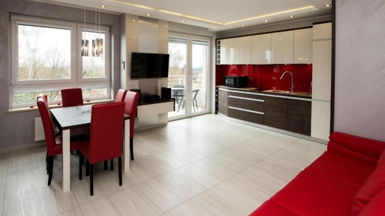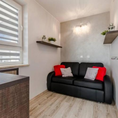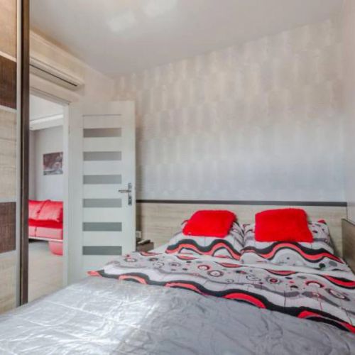 Proponujemy spędzenie wolnego czasu bądź wakacji w klimatyzowanych pomieszczeniach maksymalnie dla 6 osób. Apartament ma powierzchnię 48 m². Składa się z z salonu z aneksem kuchennym, przedpokoju, łazienki oddzielnej sypialni z łóżkiem małżeńskim, pokoju z rozkładaną sofą. Każdy pokój wyposażony jest w TV . Dla komfortowego spędzenia czasu apartament wyposażony jest w bezprzewodowy dostęp do internetu .
