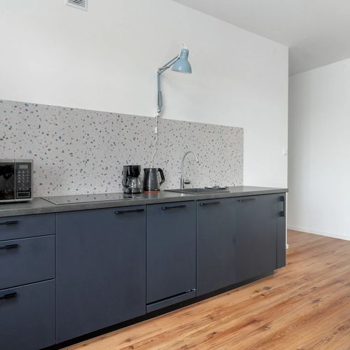 Jasny apartament o powierzchni 38 m² z przyjemnością ugości 4 osoby. Jego przestrzeń wypełniona jest eleganckimi odcieniami bieli, beżu oraz drewnianymi elementami wystroju. Wyposażenie najwyższej jakości sprawi, że nasi Goście poczują się tu naprawdę wyjątkowo oraz będą mogli w pełni się zrelaksować po podróży i podczas pobytu. Apartament składa się z salonu z aneksem kuchennym, sypialni, balkonu oraz łazienki. Przestronny salon wyposażony jest w podwójną rozkładaną sofę, nowoczesny telewizor oraz stół z krzesłami do wspólnego spożywania posiłków. W apartamencie zapewniona jest także sieć WIFI. W osobnej sypialni znajduje się wygodne łóżko małżeńskie, szafa, szafki nocne oraz pościel. Funkcjonalny aneks kuchenny wyposażony został we wszystkie przybory, niezbędne do przygotowywania posiłków. Dostępne są w nim takie udogodnienia jak: zmywarka, ekspres do kawy, kuchenka mikrofalowa oraz lodówka z zamrażarką. Nowoczesna łazienka posiada prysznic, pralkę, ręczniki oraz suszarkę do włosów. Z balkonu z meblami ogrodowymi, oglądać można widok na miasto oraz cieszyć się filiżanką ulubionej kawy lub herbaty. Apartament z przyjemnością ugości również Państwa zwierzęta domowe.