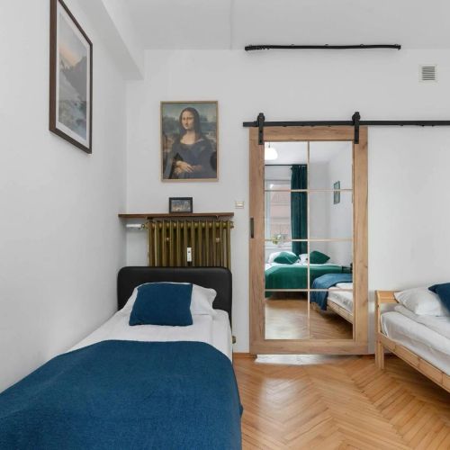 Ten wyjątkowy apartament zachwyca przestronnością, jasnością i nowoczesnym stylem połączonym z przytulnymi akcentami. Wnętrze zostało zaprojektowane z myślą o komforcie i wygodzie, zarówno podczas krótszego pobytu, jak i dłuższego wypoczynku. Jasne ściany, eleganckie dodatki i harmonijna kolorystyka sprawiają, że każdy kąt emanuje spokojem i przyjemną atmosferą. Część wypoczynkowa stanowi serce apartamentu. Znajduje się tu rozkładana sofa idealna do relaksu oraz podwójne łóżko, szafą oraz biurko z krzesłem, które umożliwia wygodną pracę. W tej strefie wypoczynkowej znajduje się stół z krzesłami oraz w pełni wyposażony aneks kuchenny, w którym znajduje się płyta indukcyjna, zmywarka, ekspres przelewowy, lodówka z zamrażarką, czajnik elektryczny, kuchenka mikrofalowa, opiekacz do kanapek, komplet naczyń i przybory kuchenne – wszystko, czego potrzeba, aby przygotować zarówno szybki posiłek, jak i wykwintną kolację. Sypialnia zapewnia spokojny i komfortowy sen wszystkim Gościom. Znajdują się tu dwa pojedyncze łóżka oraz jedno łóżko podwójne, co daje elastyczne możliwości noclegowe. Łazienka została elegancko wykończona płytkami i wyposażona w wannę. Do dyspozycji Gości przygotowano także bezpłatny zestaw kosmetyków, który umila pobyt. Apartament jest przyjazny zwierzętom, dzięki czemu Goście mogą spędzać czas w towarzystwie swoich czworonogów i cieszyć się w pełni komfortowym wypoczynkiem.