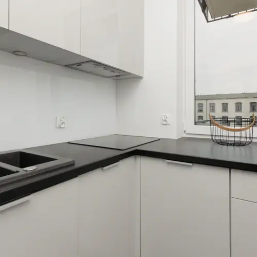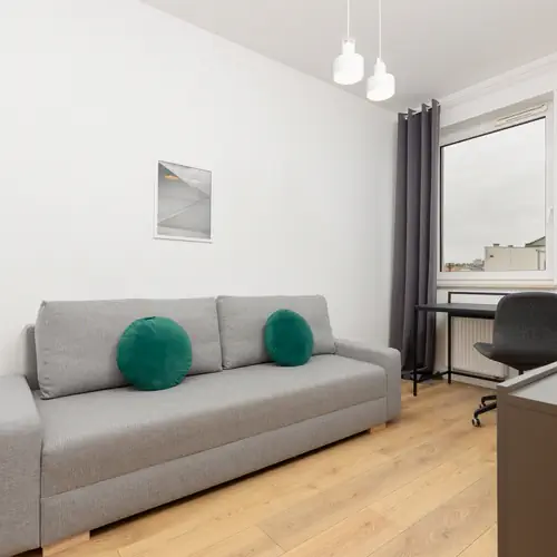 Apartament mieści się na czwartym piętrze w budynku z dostępem do windy. Przeznaczony jest dla czterech osób. To idealna opcja dla rodziny lub podróżujących wspólnie grup. Dwa miejsca noclegowe znajdują się w sypialni na podwójnej rozkładanej sofie, natomiast kolejne dwa w salonie również na podwójnej rozkładanej sofie. Pyszny posiłek przygotować można za pomocą dostępnej w kuchni płyty indukcyjnej, a także piekarnika z funkcją kuchenki mikrofalowej. Nie należy się martwić żmudnym zmywaniem naczyń – do dyspozycji Gości pozostaje również zmywarka. Podczas cieplejszych dni zaparzonej wcześniej kawy można napić się na przynależącym do apartamentu balkonie. Łazienka wyposażona jest w prysznic typu walk-in, pralkę, umywalkę oraz zestaw bezpłatnych kosmetyków. Apartament jest przyjazny osobom pracującym zdalnie – w sypialni znajduje się biurko wraz z fotelem biurowym, a w całym mieszkaniu dostępne jest szybkie połączenie WiFi. Dodatkowe wyposażenie multimedialne stanowi telewizor z płaskim ekranem. Garderoba jest osobnym pomieszczeniem. Do apartamentu przypisane jest miejsce parkingowe w garażu podziemnym. Możliwy pobyt z pupilami – obowiązuje dodatkowa opłata.