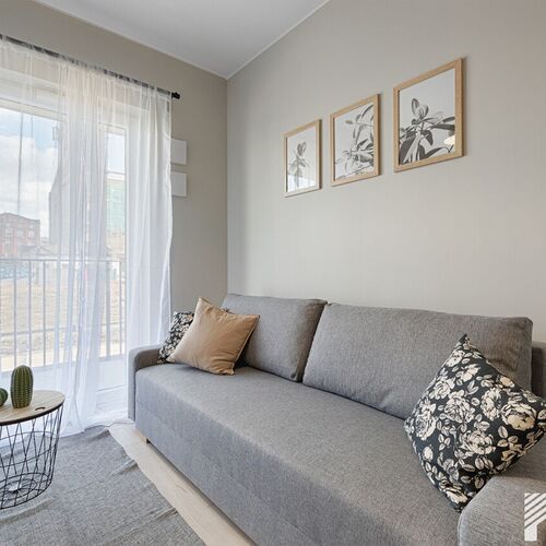 Apartament 1-pokojowy typu studio o powierzchni około 32 m2 na podwyższonym parterze w budynku z windą został w pełni zaprojektowany oraz przystosowany do wypoczynku maksymalnie 4 osób dorosłych. Składa się z salonu połączonego z sypialnią i aneksem kuchennym, łazienki z WC oraz balkonu. Wysoki standard wykończenia oraz gustowne dodatki nadają wnętrzu unikalnego, eleganckiego charakteru. Wyposażenie apartamentu obejmuje wszelkie potrzebne meble oraz sprzęty: łóżko małżeńskie, rozkładana sofa, szafa, stół jadalniany, krzesła, stolik kawowy, TV z płaskim ekranem, lodówka, płyta indukcyjna, piekarnik, zmywarka, czajnik elektryczny, pralka, żelazko, suszarka do włosów, odkurzacz. Poza tym apartament posiada dodatkowo: zastawę stołową, sztućce, przybory kuchenne, garnki, patelnię, filiżanki, kubki, świeżą pościel, puszyste ręczniki i elementy ozdobne, które pozwolą poczuć się jak w domu. W ofercie apartamentu jest także telewizja kablowa oraz bezpłatne Wi-Fi. Dookoła osiedla znajduje się bezpłatny parking publiczny.